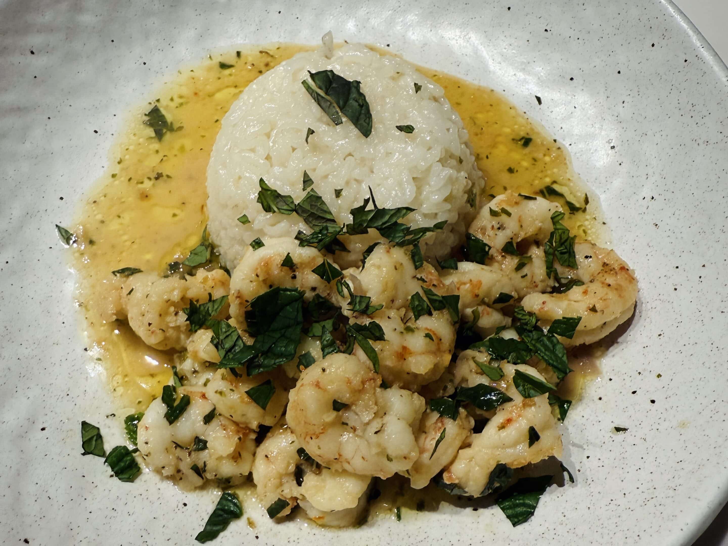 - Return the shrimp to the skillet. Add the mint and squeeze the juice from 1/2 medium lemon over the shrimp (add a little lemon zest, if you prefer too), and toss to combine. Serve garnished with more fresh mint and a bed of steaming hot rice.