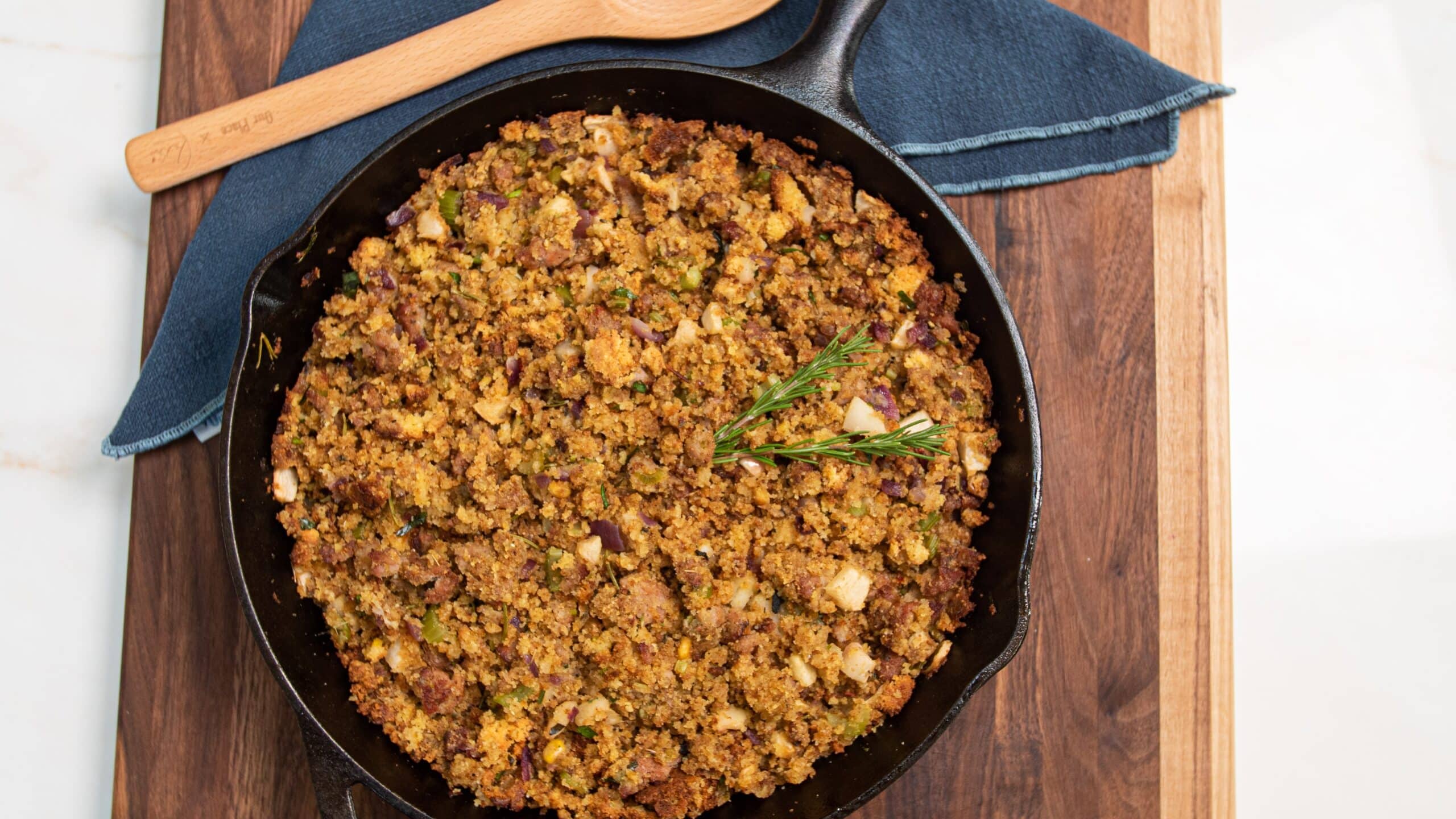 - In a large bowl, combine the following: cornbread crumbles, chicken sausage, vegetables, apples, fresh herbs, spices, melted butter and chicken broth.