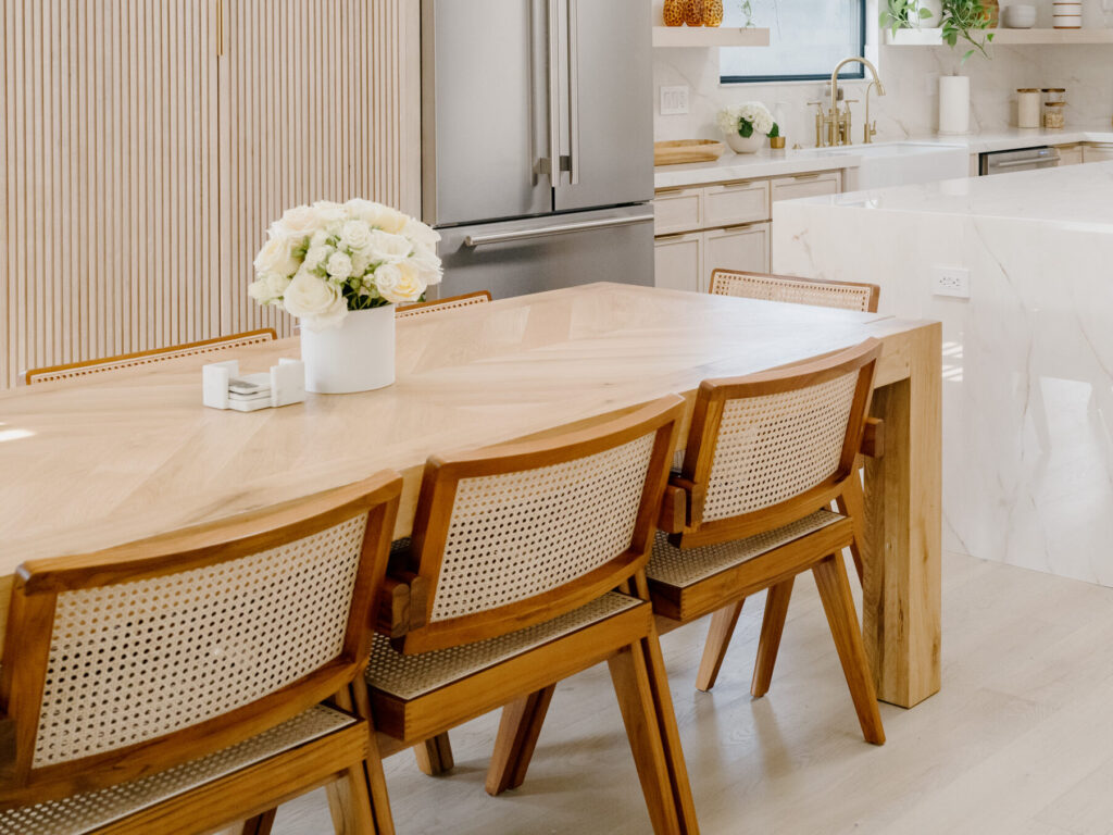 When your dining table doubles as a homework station, holiday hub, and dinner party setting, it needs to be beautiful and practical. Our founder, Lizzy Mathis’ dining area is the perfect example of elevated, family-friendly style, centered around a timeless oak table and natural rattan chairs that feel laid-back, not overdone.