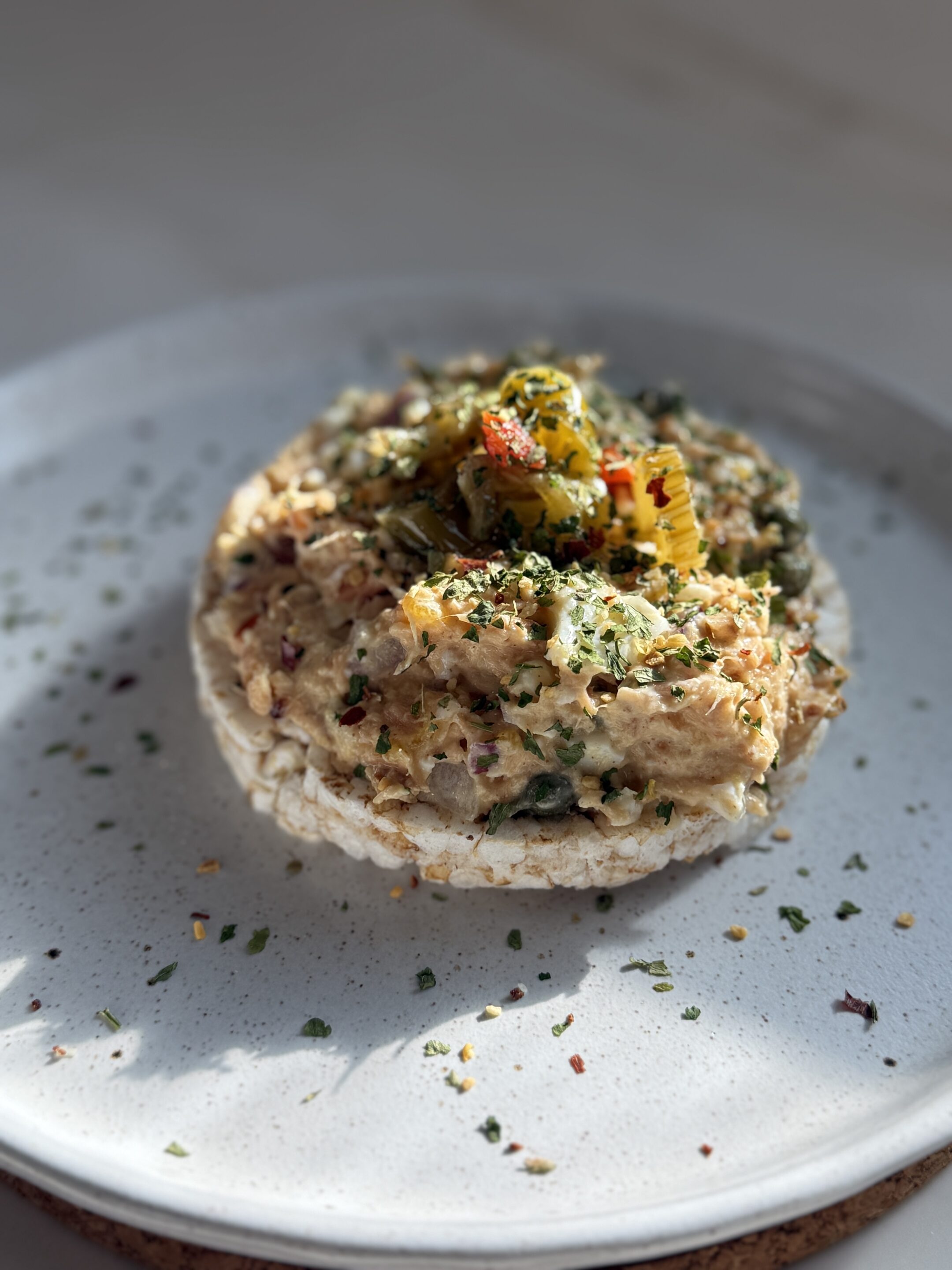 - Spoon the trout salad onto a brown rice cake. Top with extra pickled peppers and a sprinkle of seasoning.