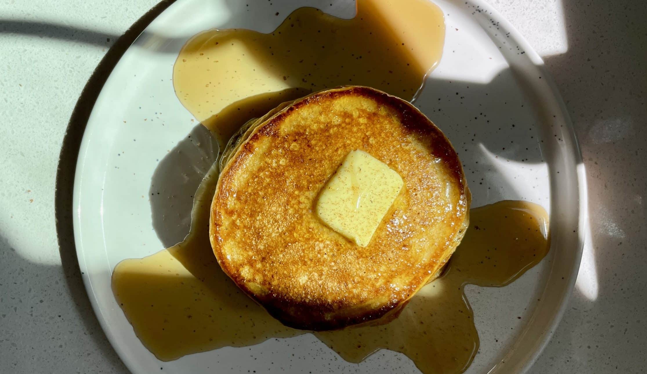 - Melt butter in a large nonstick skillet over medium heat. When butter is foamy, reduce heat to medium-low and ladle the pancake batter into skillet. Cook until bubbles start to form in the pancake (about 3 mins). Then flip and cook other side until golden.